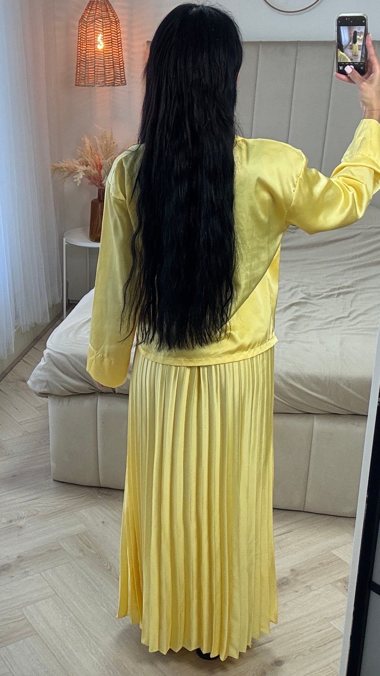 This stylish two-piece set exudes elegance with a soft satin-look finish. The wrap blouse fastens at the side with a chic gold-colored detail and can be tied as desired. The flowing pleated skirt gives the outfit a refined look and offers excellent comfort. Perfect for festive occasions, dinners, or just a fashionable day out.