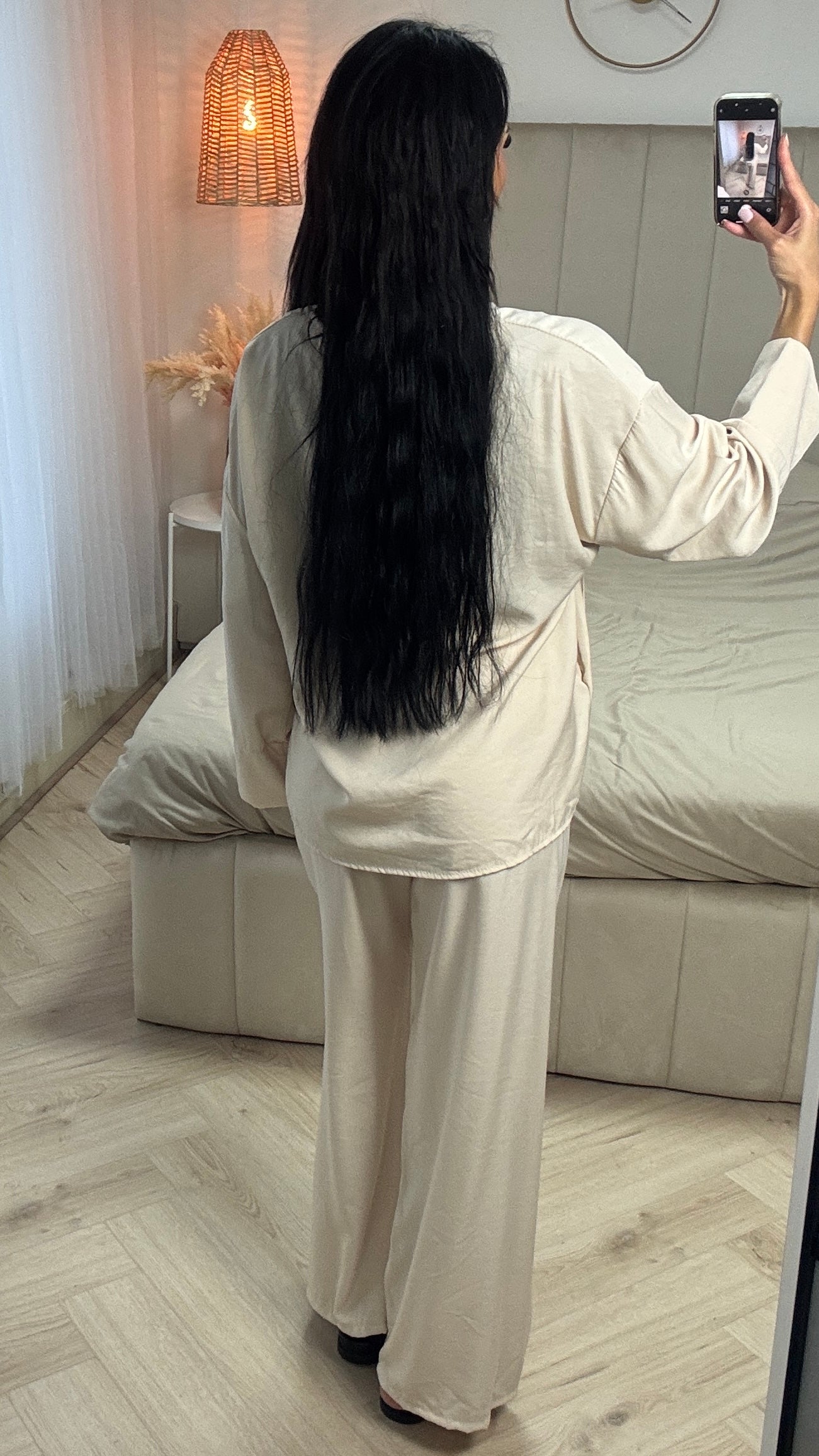 This two-piece set exudes simplicity and class. The wrap top with a side tie adds a feminine touch, while the straight-leg pants provide a comfortable and modern fit. Made from a light viscose blend that feels soft and drapes beautifully. Perfect for everyday wear or casually chic occasions.