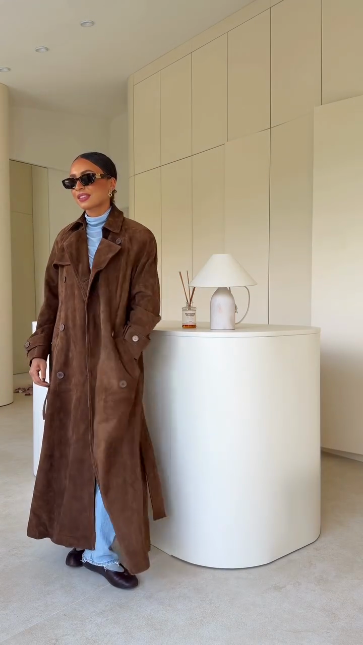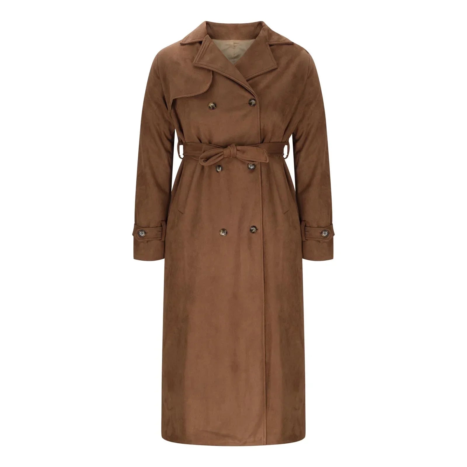 - Feature: Suede material for texture and luxury, self - tie waist for shape, classic trench design for timelessness