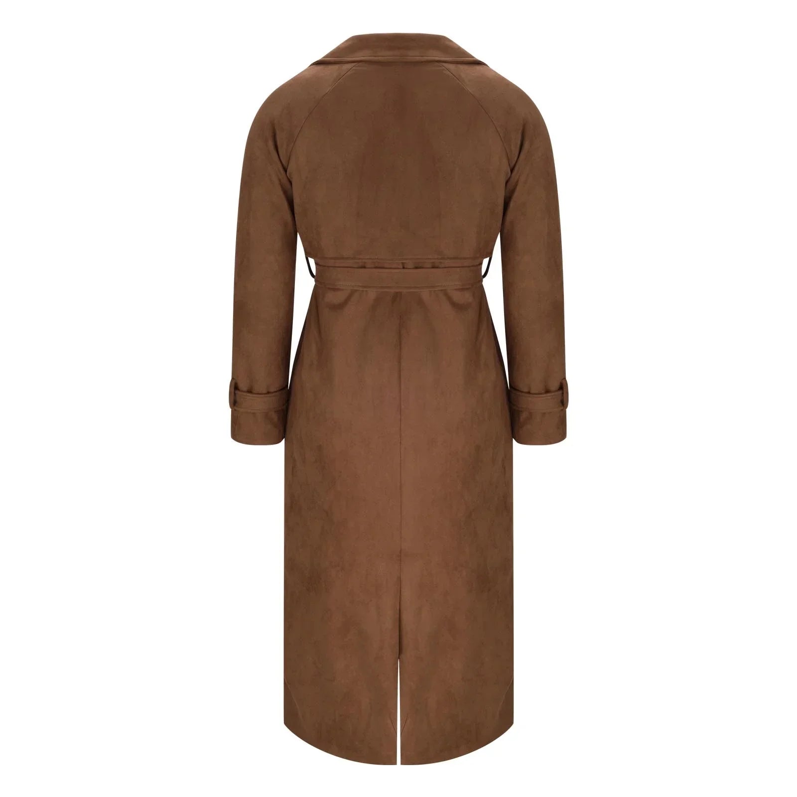 - Design: Brown suede, trench coat, notched collar, double - breasted buttons, self - tie waist belt, floor - length silhouette
