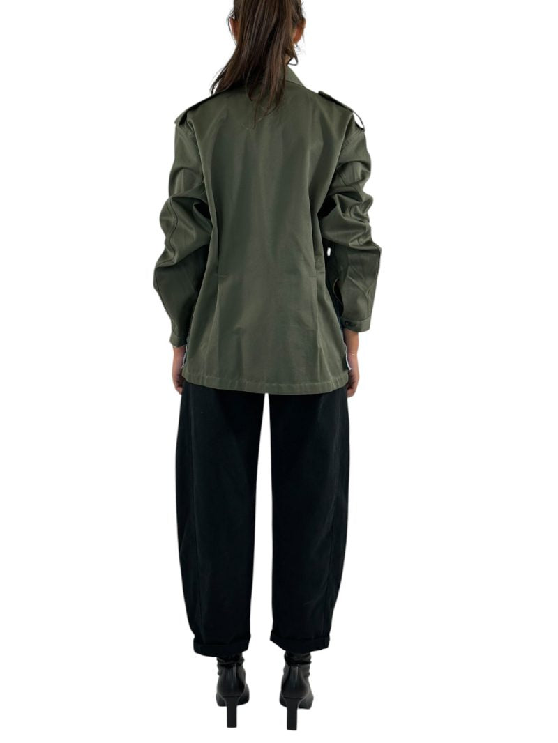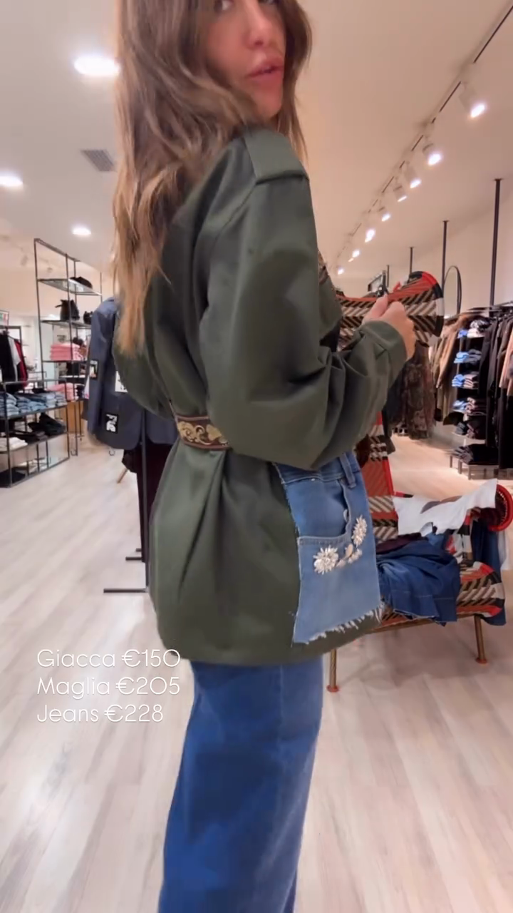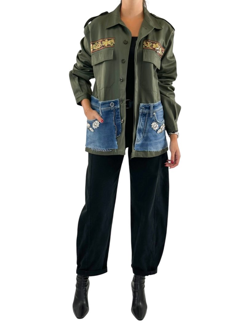 - Design: Olive green base, embroidered chest pockets, denim lower sections with rhinestone - like embellishments