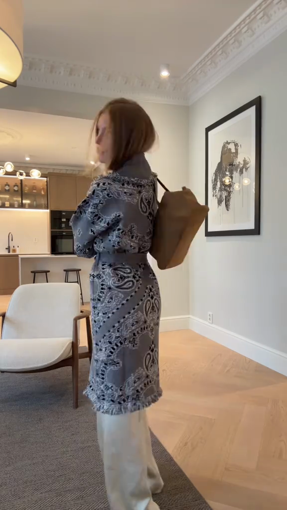 Grey Paisley - Print Fringe - Trimmed Belted Coat