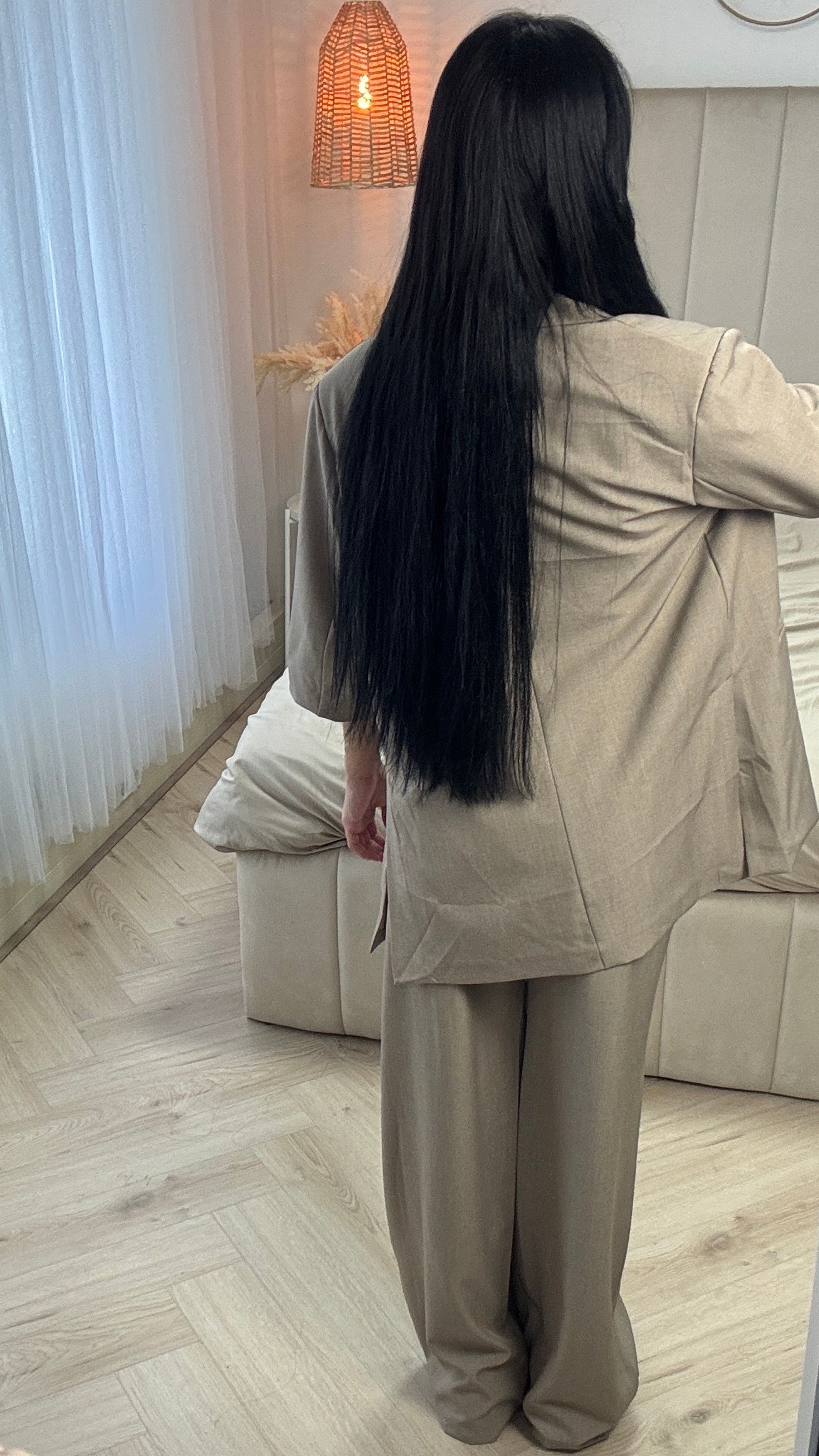 This oversized blazer suit is the perfect combination of comfort and style. The blazer has a relaxed fit with mid-length sleeves, while the trousers are loose and straight for a modern look. Ideal for a business outfit, brunch, or stylish everyday wear. Pair with sneakers or heels – whatever completes your look.