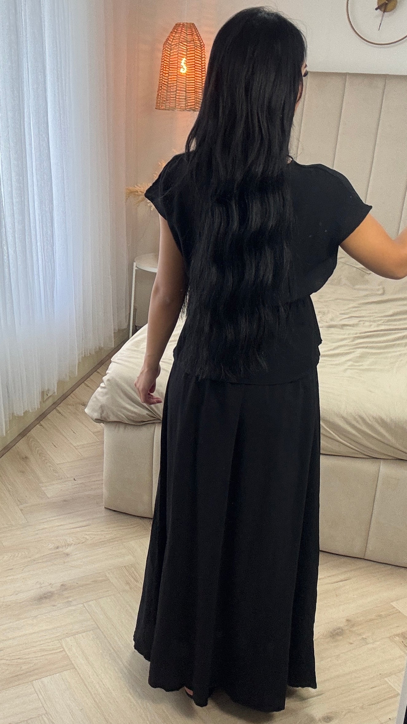 This elegant wrap set is perfect for a stylish, understated look. The top fastens crosswise and is finished with a matching buckle belt, which beautifully accentuates your waist. The loose-fitting skirt with pleats ensures a fluid fit, ideal for everyday wear or special occasions. Made from a supple viscose blend that feels soft against the skin.