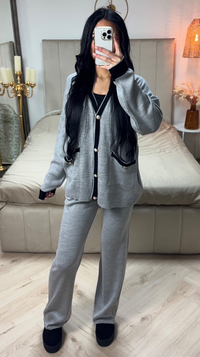 Premium Knitwear V Neck Cardigan + Wide Leg Pants Button Detail