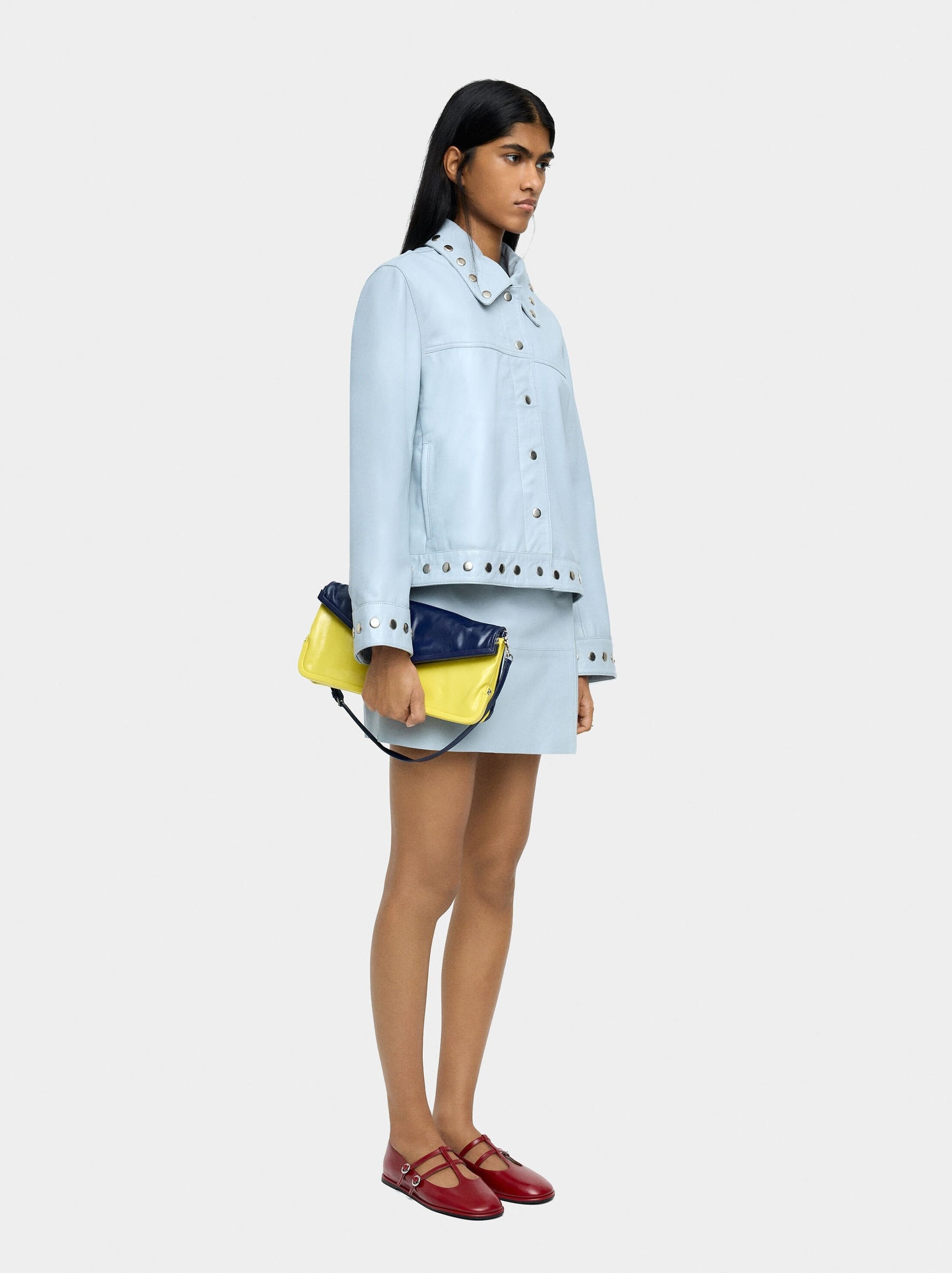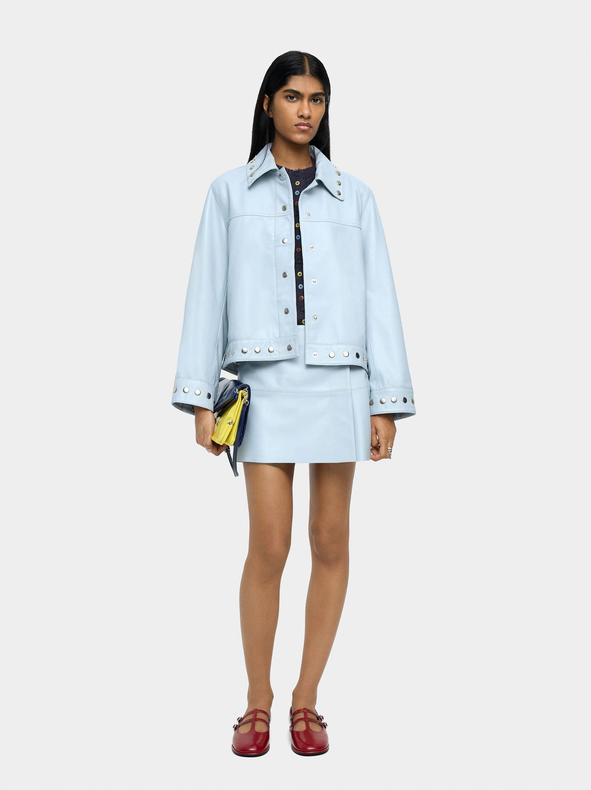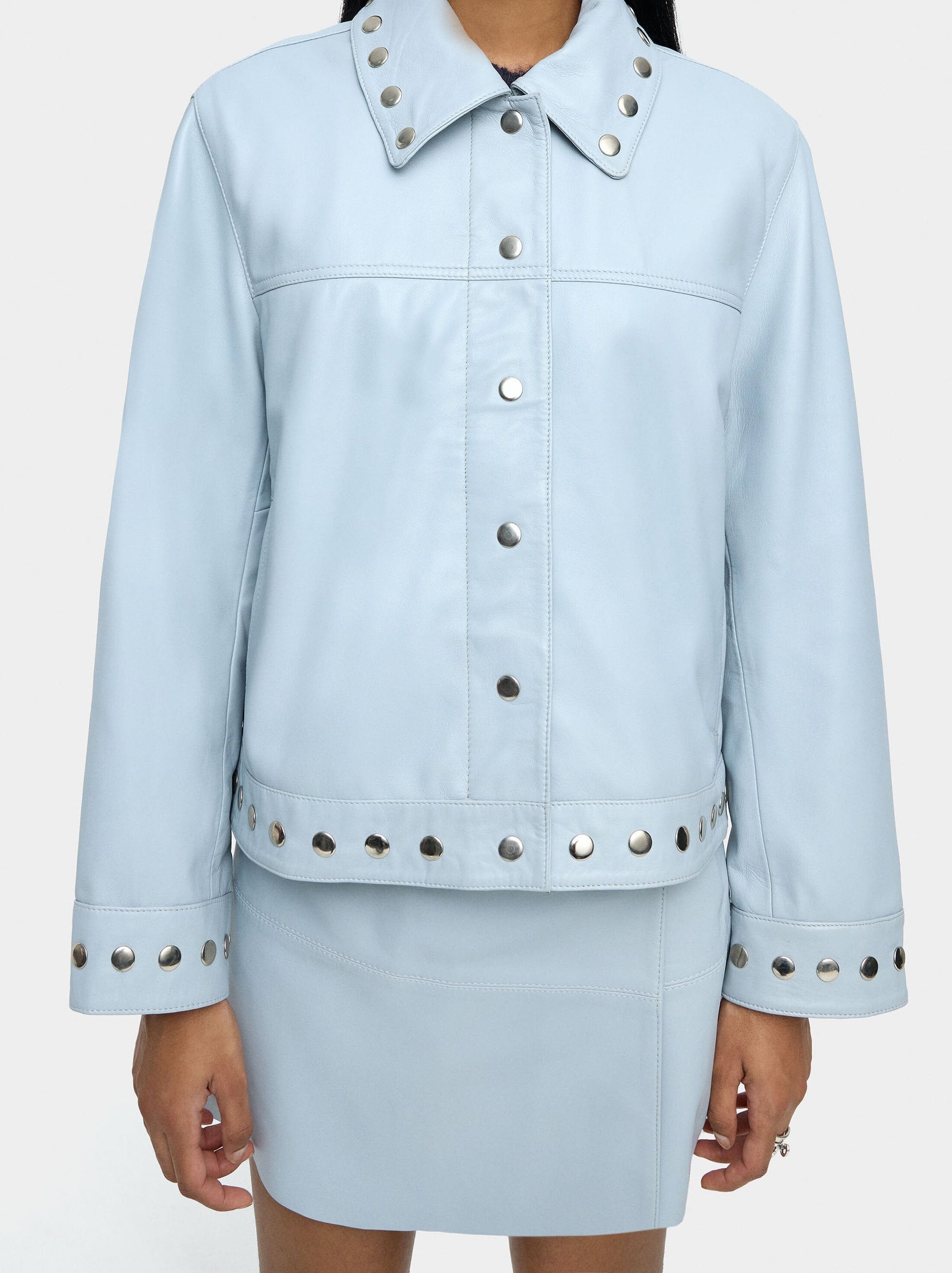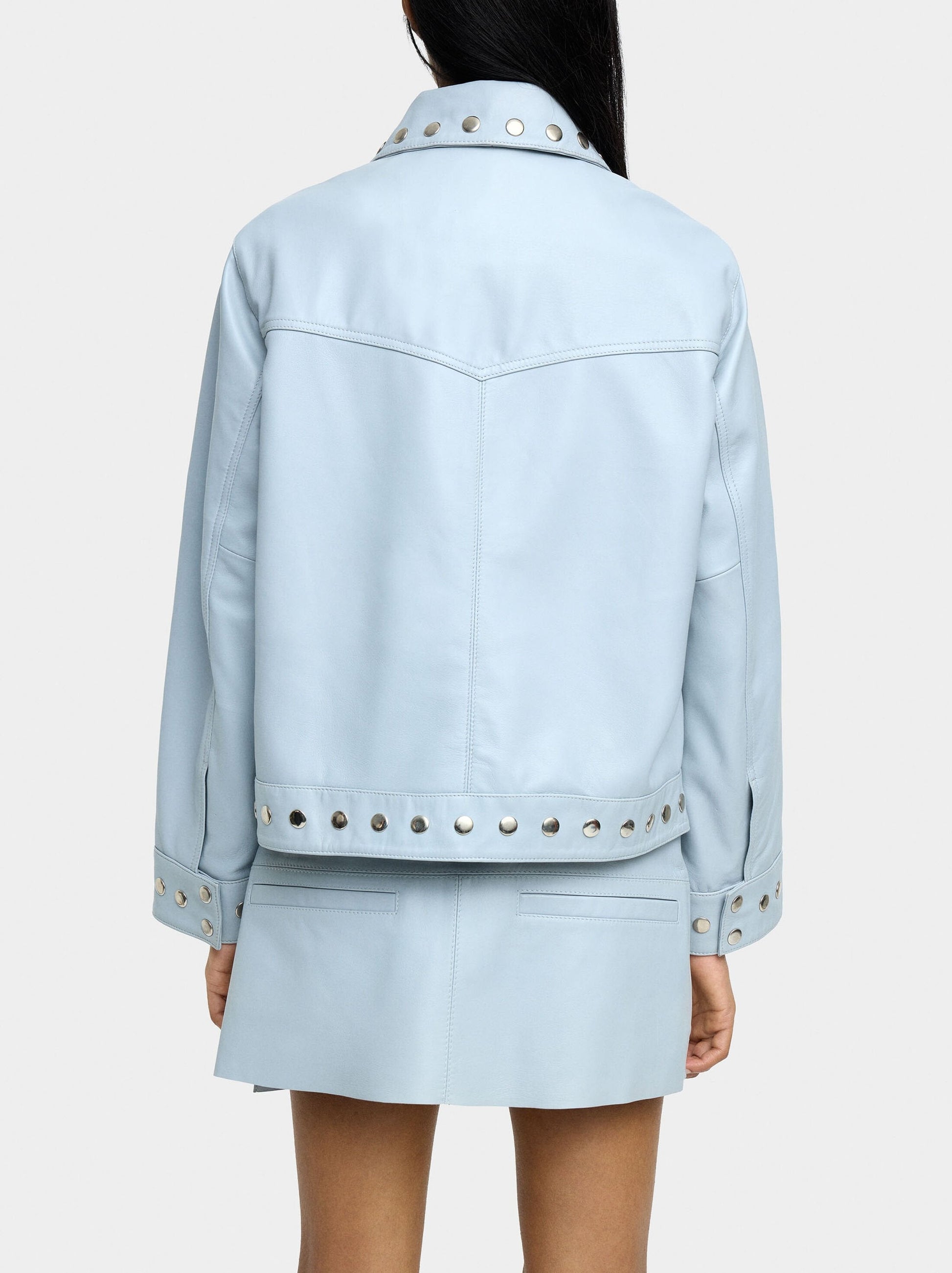 - Styling Highlights: Silver Stud Embellishments (Collar/Cuffs/Hem), Button-Front Closure, Trucker Silhouette