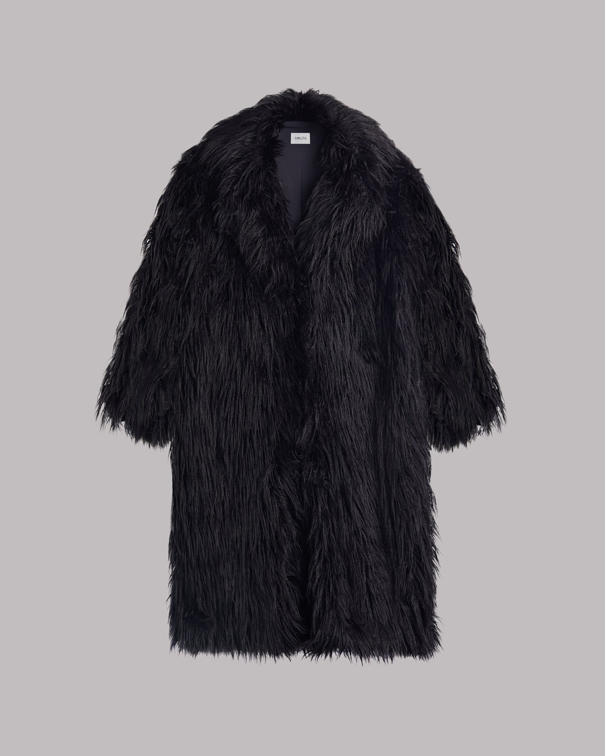 Black long faux fur coat with pockets on the sides and hook-eye closure.