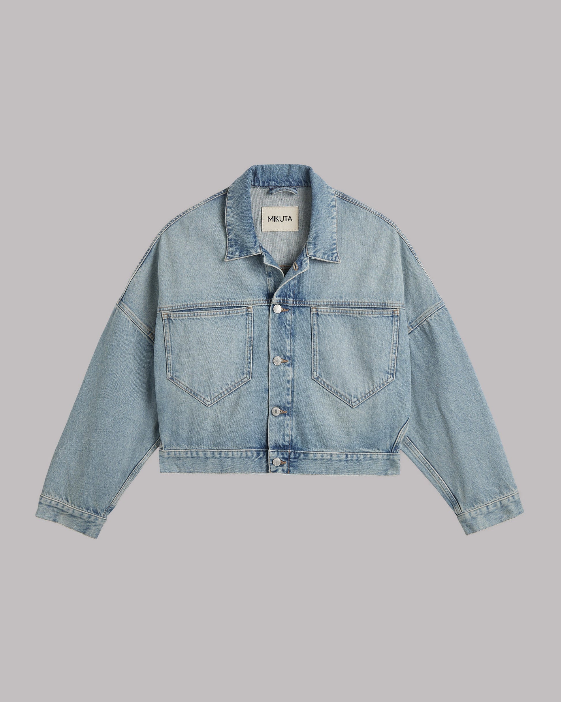 Cropped oversized denim jacket in washed blue with dropped shoulders and extra long sleeves. Two spacious pockets on the front and a silver-tone button closure.