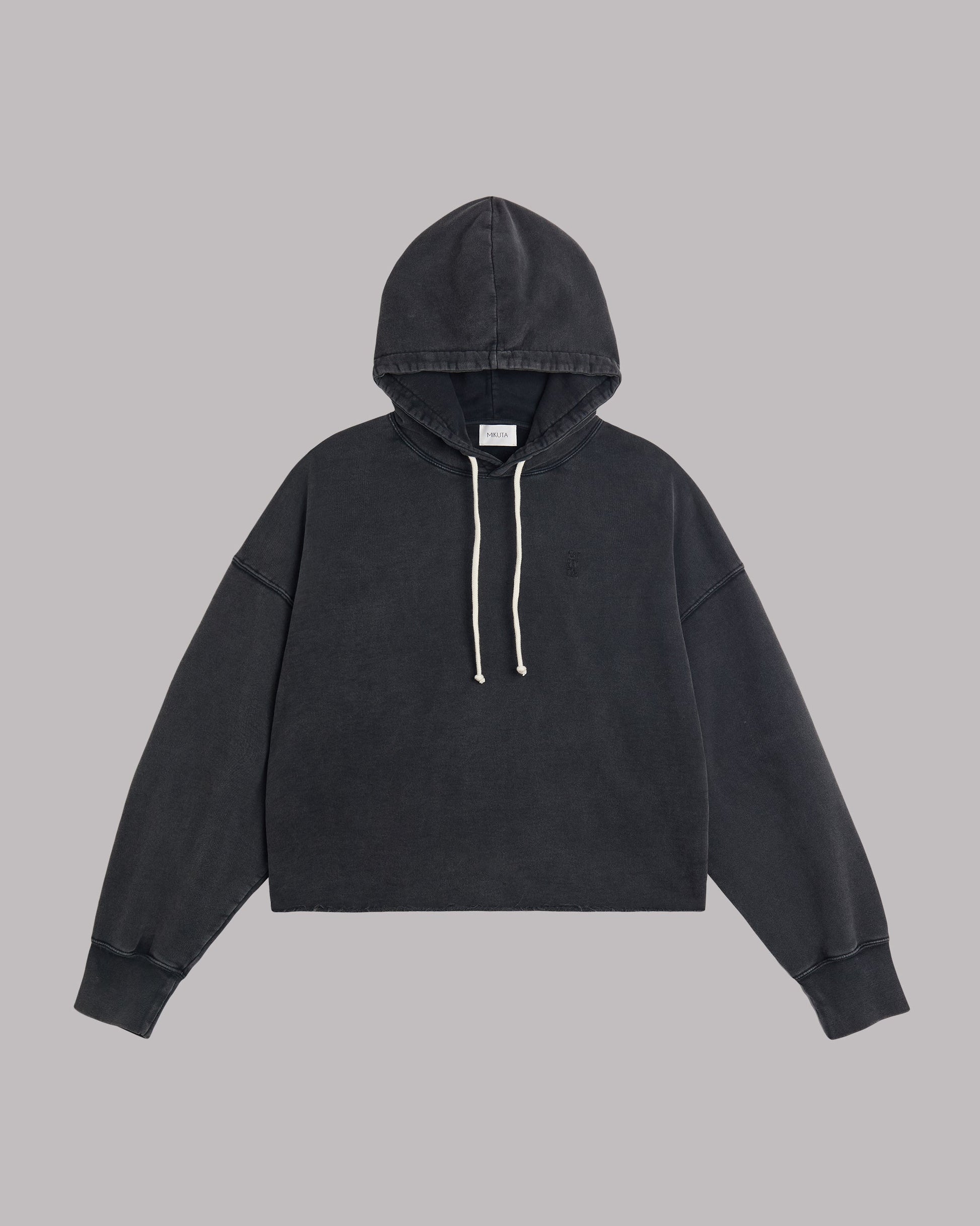 Cropped hoodie in faded black with raw hem and a peachy soft feel. Comes with an ecru ribbon and embroidered logo on the chest.