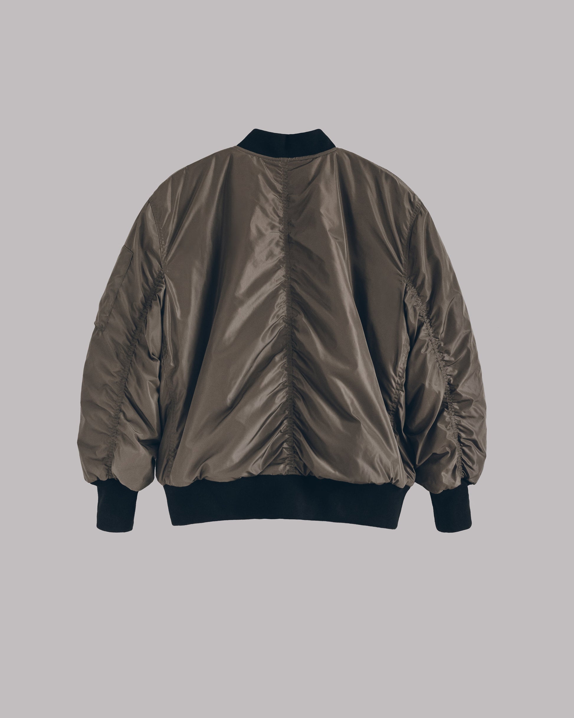 Green bomber jacket with dropped shoulders, long sleeves and two big zipped pockets on the front. There are also two hidden pockets on the sides, plus one zipped pocket on the sleeve.