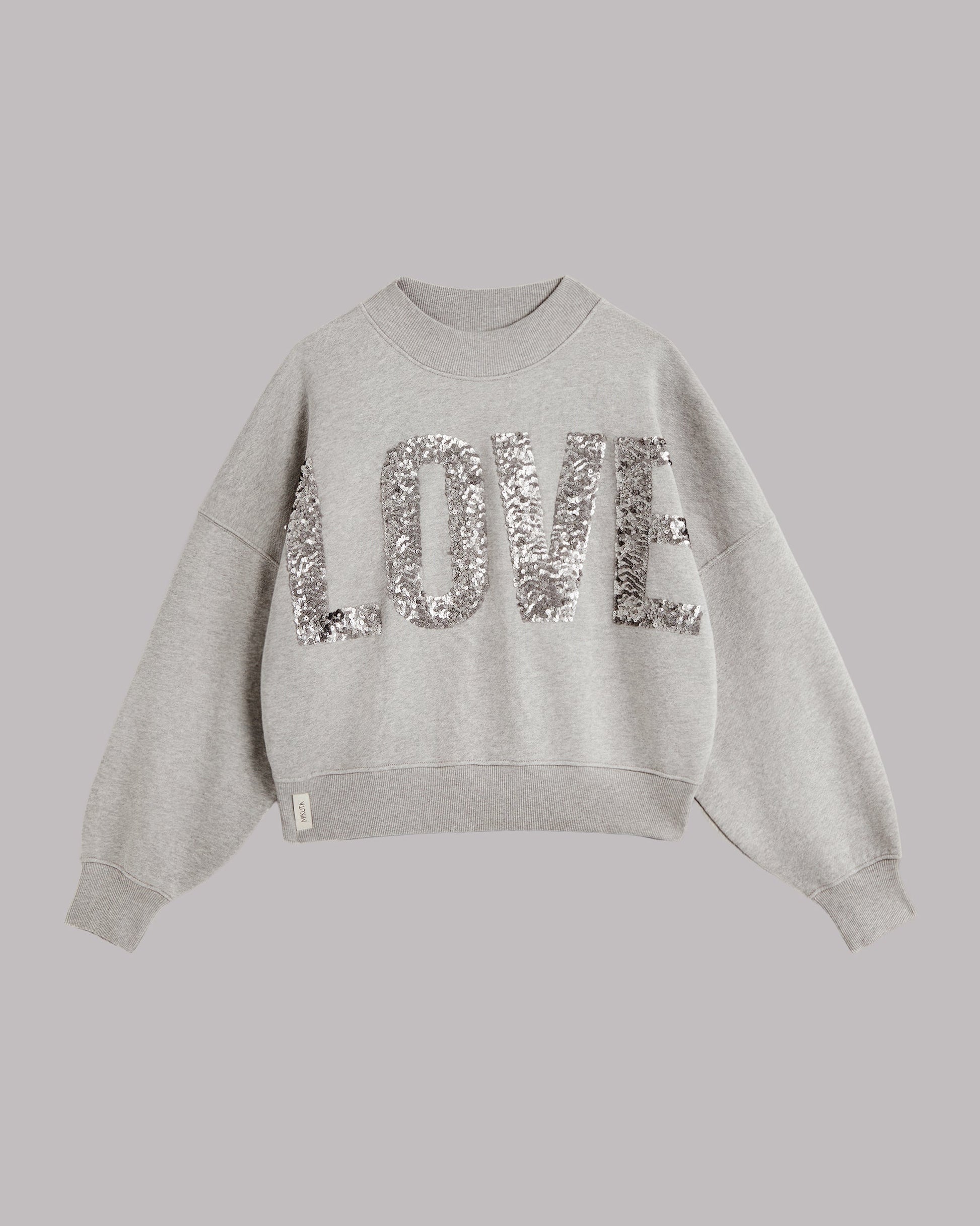 Relaxed sweater in grey with LOVE embroidered in silver sequins on the chest.