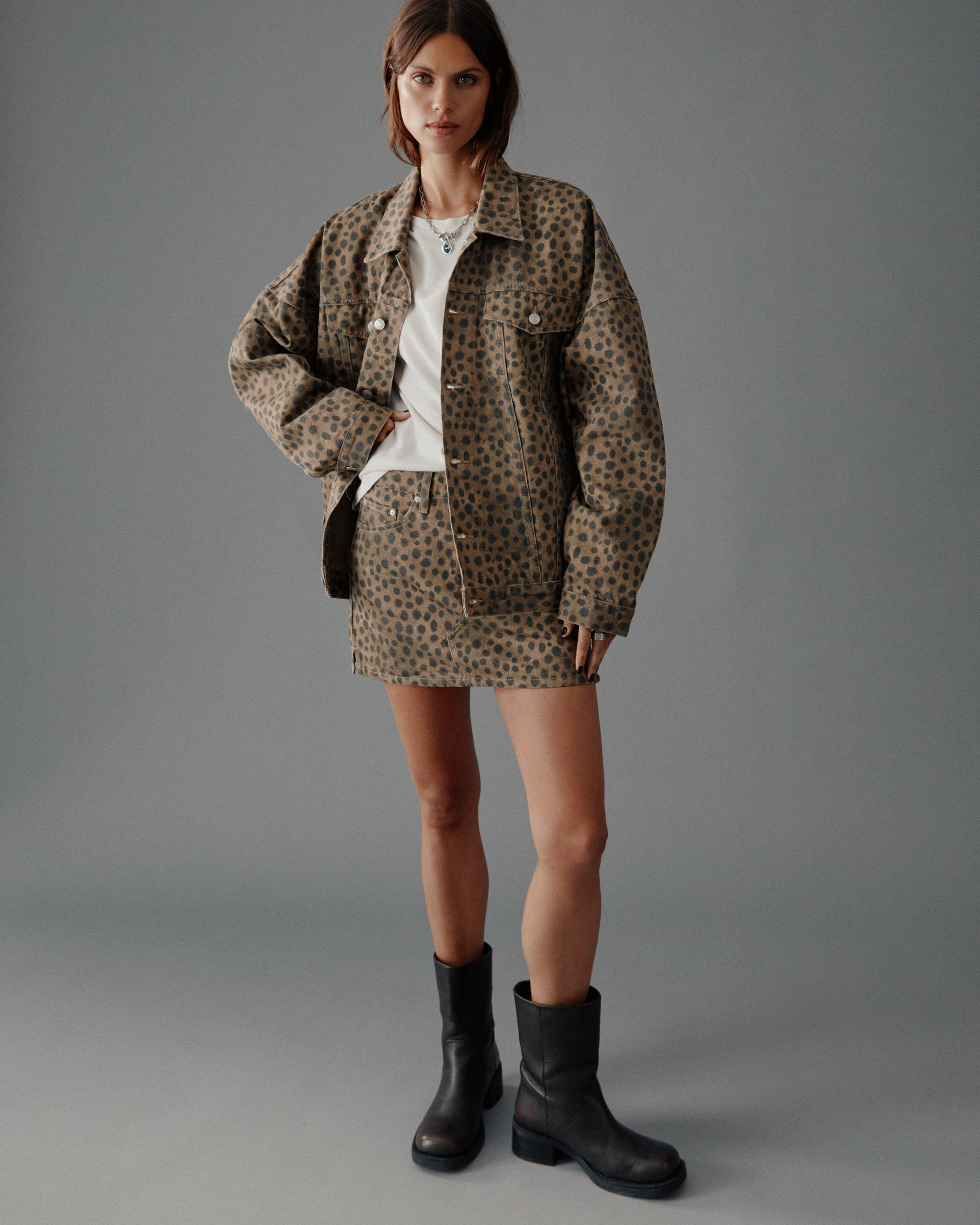 Oversized denim jacket in our in-house custom Leo print with dropped shoulders, two chest pockets and hidden pockets on the sides. Comes with distressed edge detailing.