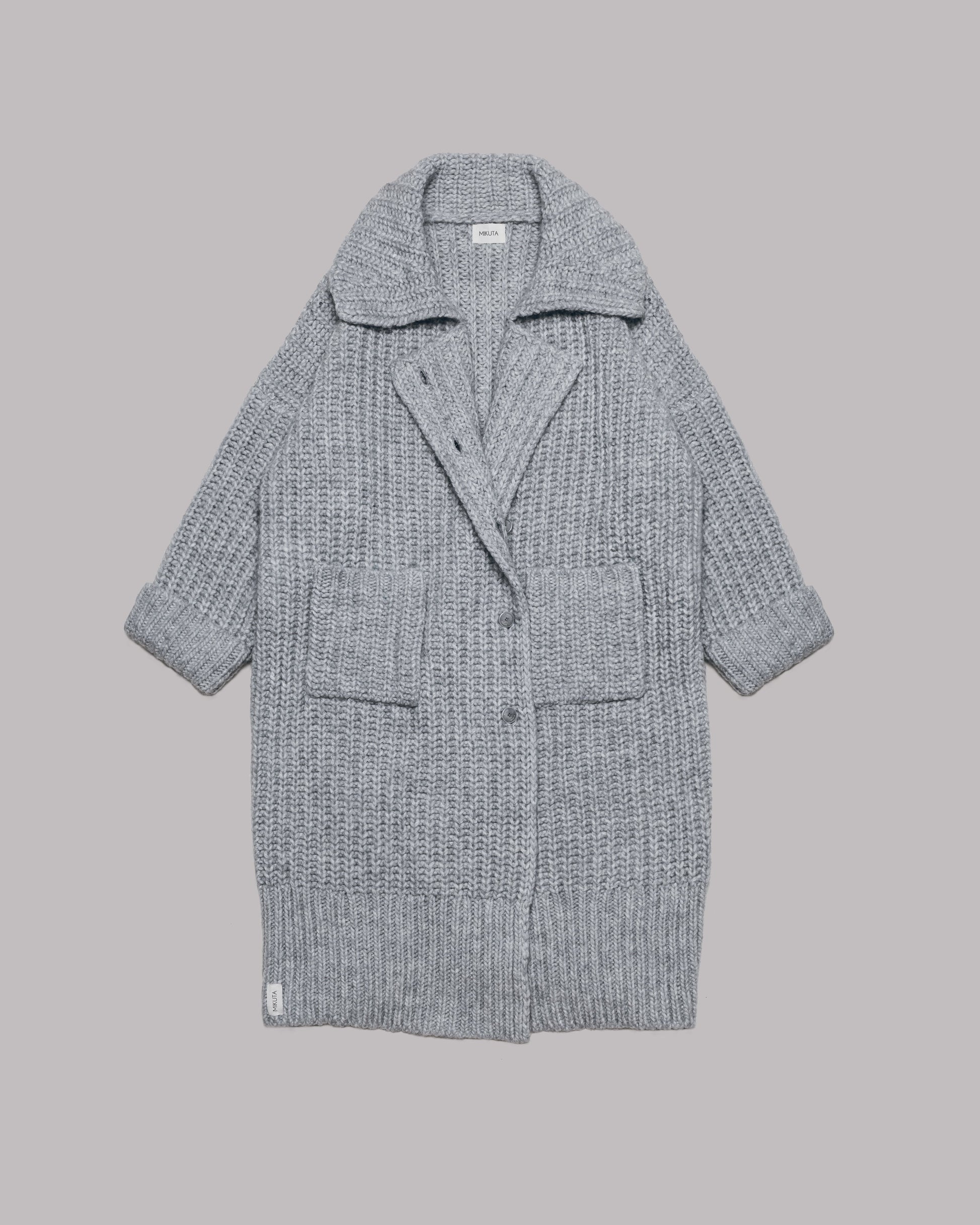 Oversized, chunky and non-itchy knitted cardigan in grey melange with buttons and pockets on the side.