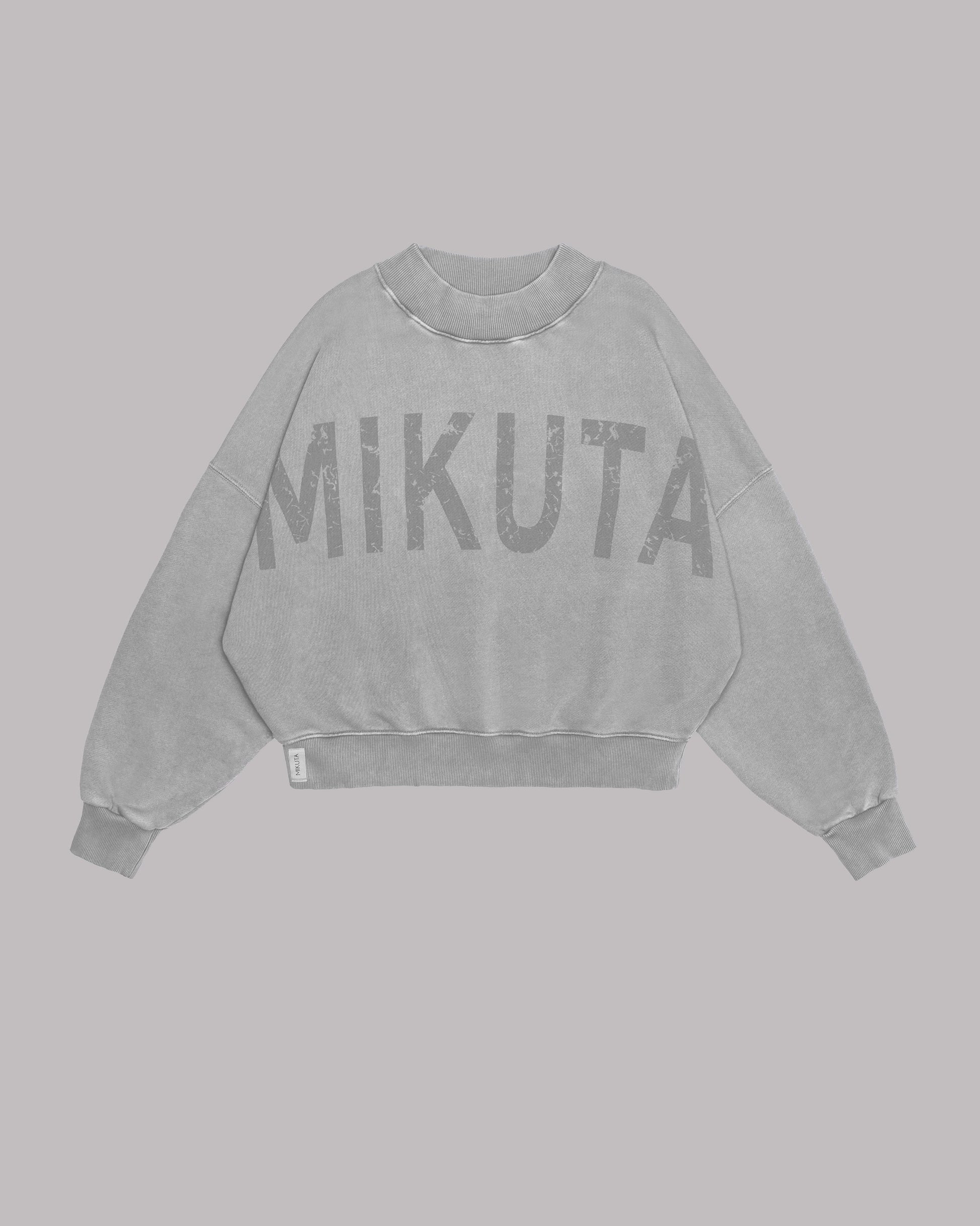 Oversized cotton sweater in light grey with faded MIKUTA print.