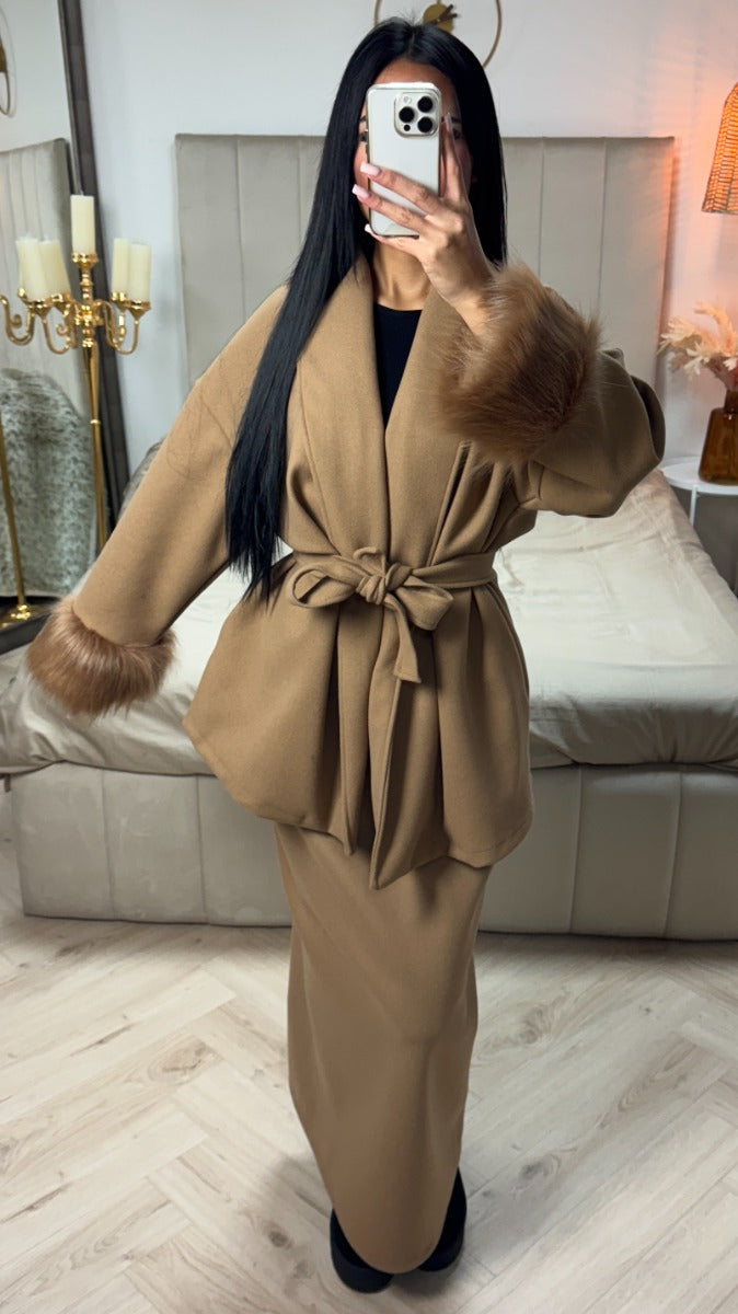 đź”–Tie Belt Fur Sleeve Cardigan Skirt Set
